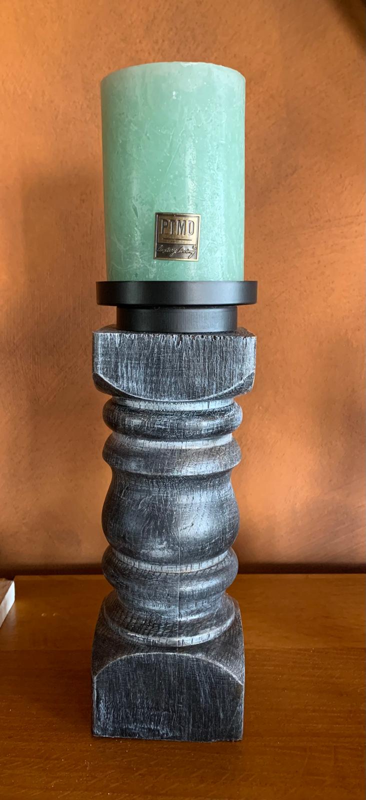 Kandelaar van gerecycled hout met zwart en witte wax